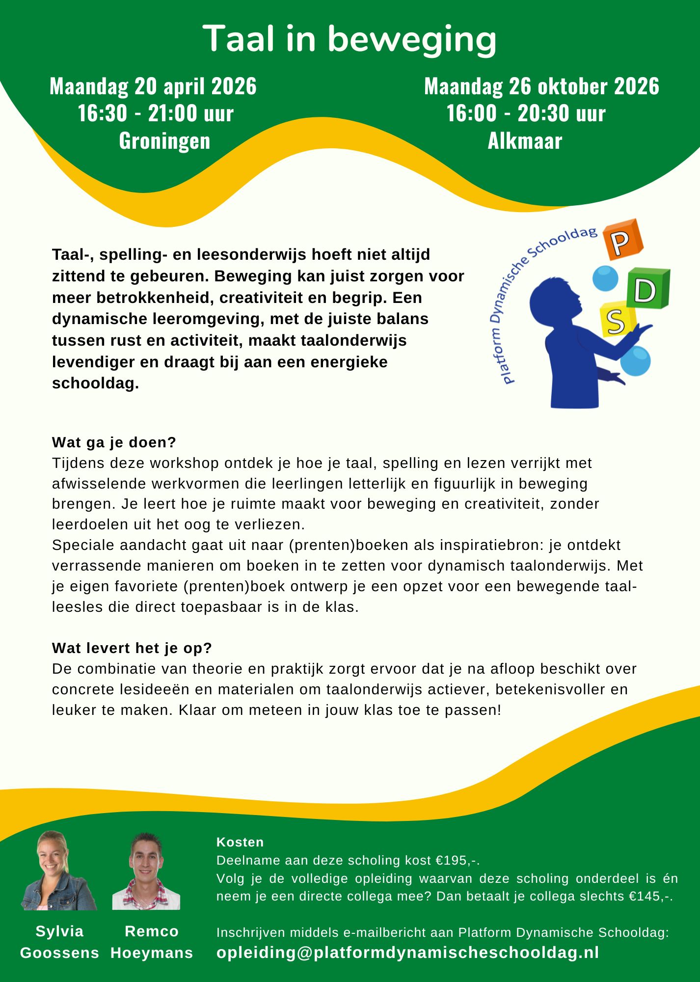 Naast dat ik workshops en begeleidingstrajecten op scholen geef, ben ik ook mede eigenaar van Platform Dynamische Schooldag. Ook vanuit daar heb ik een missie! Kinderen leren niet optimaal door stil te zitten. Afwisseling met ontspanning, beweging en buiten zijn is essentieel voor hersenontwikkeling, taakgerichtheid en gedrag in de klas. Wordt Coördinator Dynamische Schooldag en maak het verschil op je eigen school.